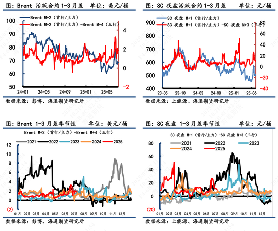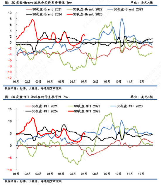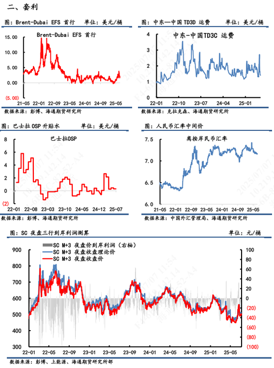 2)套利:①估值:7月4日凌晨2:30,Brent 2509盘面价为68.74美元/桶,SC 2510盘面价为502.1元/桶,测算SC 2510盘面理论价为510.1元/桶,当天盘面估值偏离程度-1.57%。从7天移动平均估值值中,以【-5%,0】为正常区间来看,目前仍处于合理估值范围内。②利润:测算SC2510盘面到岸利润-8.01元/桶,折合-1.12美元/桶。③价差:SC2510-Brent2509盘面差为1.35美元/桶,理论差2.47美元/桶,盘面价差低于理论价差。(注:本周Brent首行为2509;SC首行为2510;其中M代表时下7月)